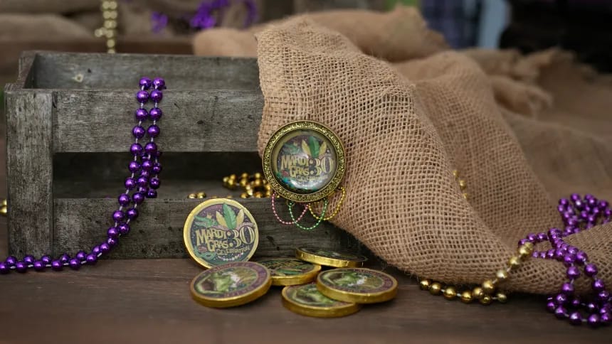 Mardi Gras 30 Coin & Beads Bubble Pin and Chocolate Coins